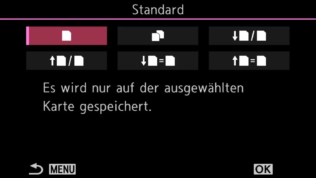 Die Kamera wird in der Standardeinstellung ausgeliefert. Du kannst selbst bestimmen, auf welcher der beiden Karten du speichern willst. Ist die Karte voll, bekommst du von der Kamera eine Nachricht und du kannst nicht weiterarbeiten, bis der Speicherplatz auf der Karte ausreicht. In der Standardeinstellung kannst du individuell für Fotos und Videos die Karte, auf der die Daten gespeichert werden sollen, festlegen, zum Beispiel Fotos auf Karte 1 und Videos auf Karte 2. Das ist schon sehr hilfreich, wenn du Bilder und Videos auf deinen Rechner herunterladen willst.