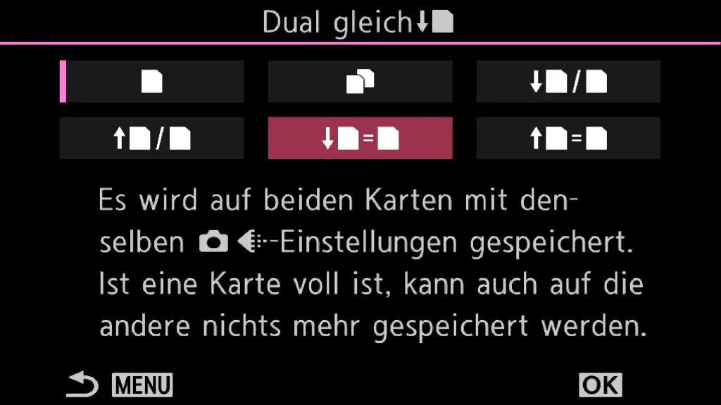 Wenn du die beiden Einstellungen Dual Gleich und Dual Individuell einstellen willst, wird dir auffallen, dass es jeweils eine Einstellung mit einem Pfeil nach oben und eine mit einem Pfeil nach unten gibt. Verwendest du den Pfeil nach unten, wird die Aufnahme eingestellt, wenn eine der beiden Karten voll ist; so ist sichergestellt, dass du die Bilder immer in den beiden Formaten, die du eingestellt hast, hast. Verwendest du den Pfeil nach unten, kannst du weiterarbeiten, auch wenn eine der beiden Karten voll ist. Allerdings nur noch in dem Format, welches du für die Karte, die noch nicht voll ist, eingestellt hast.